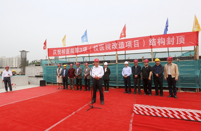 李和章代表学校致辞,对各参建单位在beat365在线唯一官网登录校医院改造项目中的辛勤付出表示感谢。校医院改造项目是学校“十三五”重点建设项目之一,是关系到全校师生员工医疗、卫生服务的重要民生工程。学校经多方筹措资金,克服场地狭小、周边环境复杂等多项不利因素,最终顺利实现结构封顶。学校和各参建单位将再接再厉,一道完成后续工程的施工任务。最后,李和章宣布中关村校医院改造项目结构封顶。