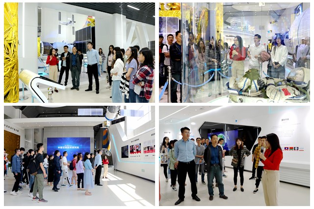 随后,师生们跟随工作人员共同参观了导航定位、通信广播、对地观测、空间科学与技术试验、深空探测、载人航天六大系列航天器模型和部分实物,近距离地看到了媒体报道中的人造卫星、发射器、地面站系统等。一张张图片、一件件模型与实物,展示了航空技术在卫星通信传输、气象服务、农业育种等领域的广泛应用。尽管短时间内很难全面了解专业高精设备中的奥秘,但师生们真切体会了航天技术的复杂与精细,震撼、惊叹于我国航天事业的重大科技成就,为祖国倍感自豪。