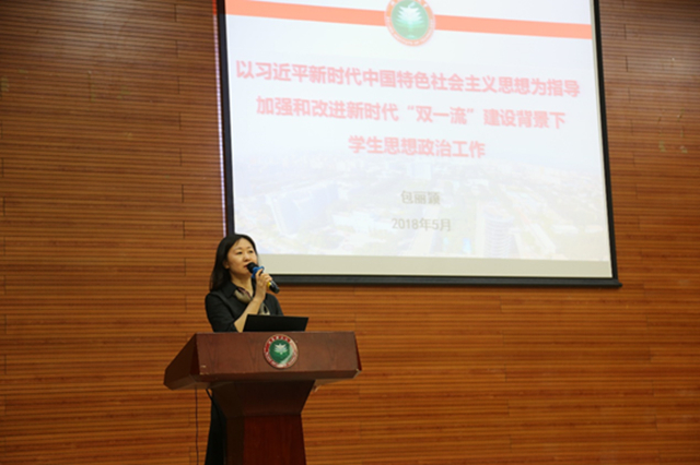 包丽颖以《以习近平新时代中国特色社会主义思想为指导加强和改进新时代“双一流”建设背景下学生思想政治工作》为题作专题报告。包丽颖强调,新的时代背景下党对高校办学育人提出了新要求,新时代学生思想政治工作要以习近平新时代中国特色社会主义思想、习近平教育思想和全国高校思想政治工作会议精神为开展依据。关于新时代学生思想政治工作基本思路,一要聚焦根本性、基础性问题,注重内涵建设、内涵发展,强化政治意识、质量意识;二要坚持“继承发扬与开拓创新相结合,系统推进与重点突破相结合,资源整合与全员育人相结合,学生受益与学校发展相结合”;三要围绕立德树人根本任务,巩固深化全员全过程全方位育人格局;四要构建思想深度、工作力度、情感温度、成果效度有机统一的新时代思想政治工作体系;五要以务实管用的思想引领、价值塑造、成长服务为领军领导人才培养打好坚实基础。