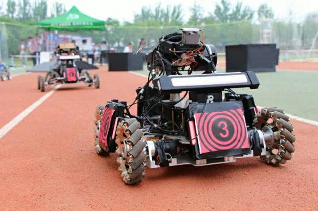 比赛采用红、蓝双方对抗的形式,参赛队伍通过自行设计制造多种机器人进行射击对抗。参赛队员需要遥控可以发射“弹丸”的手动机器人在复杂的场地中移动并发射“弹丸”,攻击对方机器人和基地,击毁敌方机器人方为获胜。