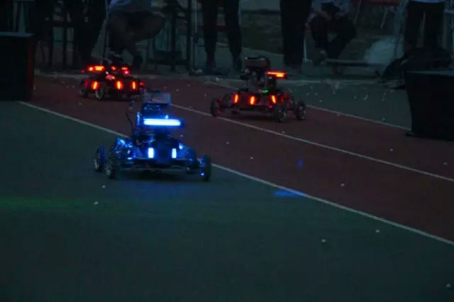 夜幕降临,一辆辆战车在场内走位、射击,机器人身上的“血量”显示板和发射的红绿光线在晚上显得清晰异常,围场内机器人大战硝烟四起,机器人灵活的“漂移”和精准的射击,让整个赛场变成了五彩缤纷的光影世界,绚丽多彩,热闹非凡……操控手们都在聚精会神、全力以赴,观众则在两位解说员幽默风趣的讲解下看得津津有味。