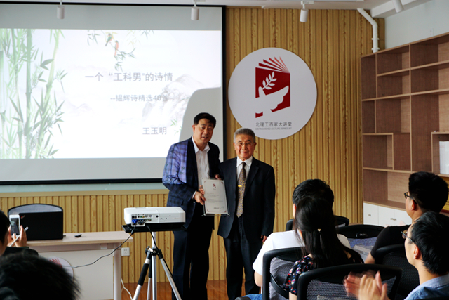 5月22日下午,中国工程院院士、清华大学机械工程系教授、中华诗词学会顾问、清华大学荷塘诗社名誉社长王玉明做客北理工百家大讲堂,为在场师生带来一场题为《一个“工科男”的诗情》的诗词盛宴。学校副书记、副校长项昌乐向王玉明院士颁发北理工百家大讲堂纪念证书。