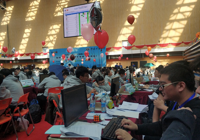 ACM国际大学生程序设计竞赛(ACM International Collegiate Programming Contest)由美国计算机协会主办,迄今已经成功举办了42届,是世界上公认的规模最大、水平最高的国际大学生程序设计竞赛。本次ACM-ICPC亚洲区域赛的徐州站比赛由中国矿业大学承办,聚集了包括清华大学、北京大学、浙江大学、上海交通大学、南京大学等知名高校在内的166所高校、2所中学和1家企业参赛,288支参赛队伍、863名程序设计精英在比赛现场展开了激烈的奖牌争夺战。其中由我校计算机学院三名2016级学生龙水彬、周赫斌和程苗苗组成的“肥宅大哭.jpg” 队发挥稳定,比赛中一直处于领先地位,从众多参赛队伍中脱颖而出,荣获金牌和最快解题奖。这也是本年度我校ACM俱乐部继南京赛区和沈阳赛区夺金后在此类赛事上累计荣获的第三块金牌!另两只队伍“北理六队”和“摸鱼肥宅”队也分别依靠丰富的比赛经验和不屈不挠的韧性夺得一块银牌和一块铜牌。