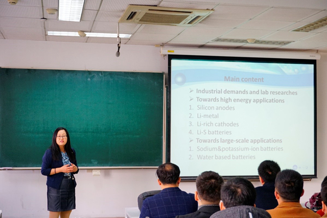 在这次演讲中,郭再萍教授详细介绍了她的研究团队近几年在金属离子电池的先进电极材料领域的最新成果,阐述了在合成不同类型的混合纳米结构电极材料以提高金属离子电池的电化学储能性能方面的一些最新进展。报告的互动交流环节,郭再萍教授还就中子辐射测试和红外显微成像等问题与在场师生进行了讨论和交流。